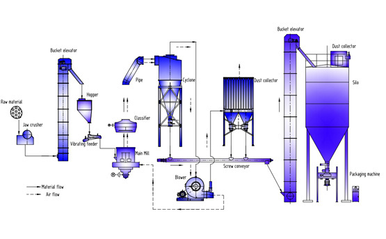1、破碎階段:大塊物料經破碎機破碎到能進入磨粉機的入料細度(15mm-50mm)。