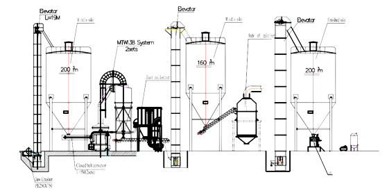 磨粉系統采用兩臺MTW138,細度100mesh,單臺產量13t/h,一臺正常生產,一臺備用。