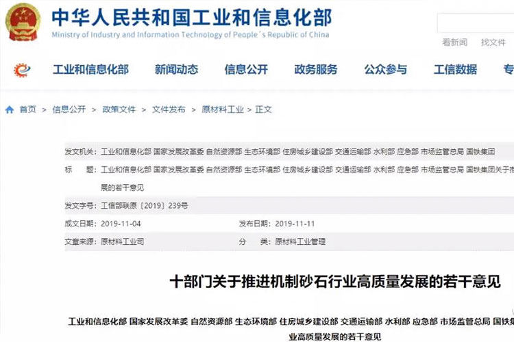 2019年11月11日,工業和信息化部、國家發展改革委、自然資源部、生態環境部、住房城鄉建設部、交通運輸部、水利部、應急部 、市場監管總局和國鐵集團等國家十部門發布《關于推進機制砂石行業高質量發展的若干意見》(以下簡稱《意見》)。