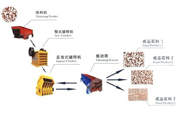 大塊石料經料倉由振動給料機均勻的送進顎式破碎機進行粗碎,粗碎后的石料由輸送機送到反擊式破碎機進行進一步破碎,細碎后的石料由輸送機送到振動篩進行篩分,篩分出幾種不同規格的石子,滿足顆粒要求的石子,由成品輸送機送往成品料堆,不滿足顆粒要求的石子,由輸送機返料送到反擊式破碎機進行再次破碎,形成閉路多次循環,成品粒度可按照用戶的需求,進行組合和分級,為保護環境,可配置輔助的除塵設備。