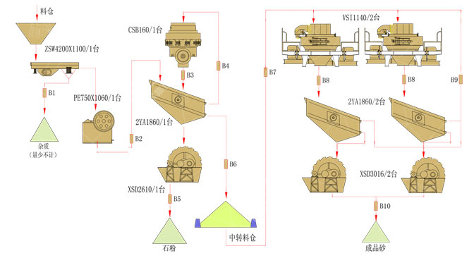 核心設備主要包括顎式破碎機、反擊式破碎機、圓錐破碎機、制沙機等設備組成。