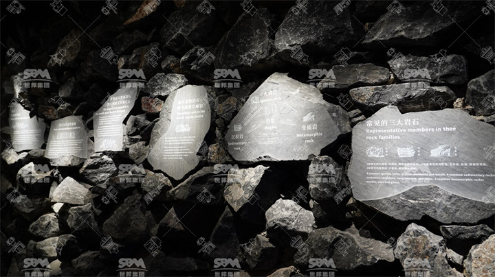 推門而入,映入眼簾的便是利用3D打印技術造的小型宇宙,還原了宇宙50億年的滄桑巨變。同樣結合3D打印技術,我們制作了一個仿真地球,較大程度還原了地球表層的地質地貌。在巖石的分類區,您可以看到由1815塊石頭砌成的礦洞,這些石頭均來自世邦自有石料礦,包含火成巖、沉積巖、變質巖。