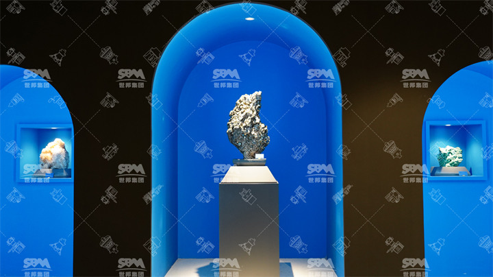 礦博館是世邦集團自主策劃、自主設計、自主搜集展標、自主施工的項目,共分為三個大廳:礦石起源廳、巖石礦物廳、礦石加工應用廳,陳列了近4000件來自世界各地的礦石及諸多客戶現場帶回的成品砂石骨料等。