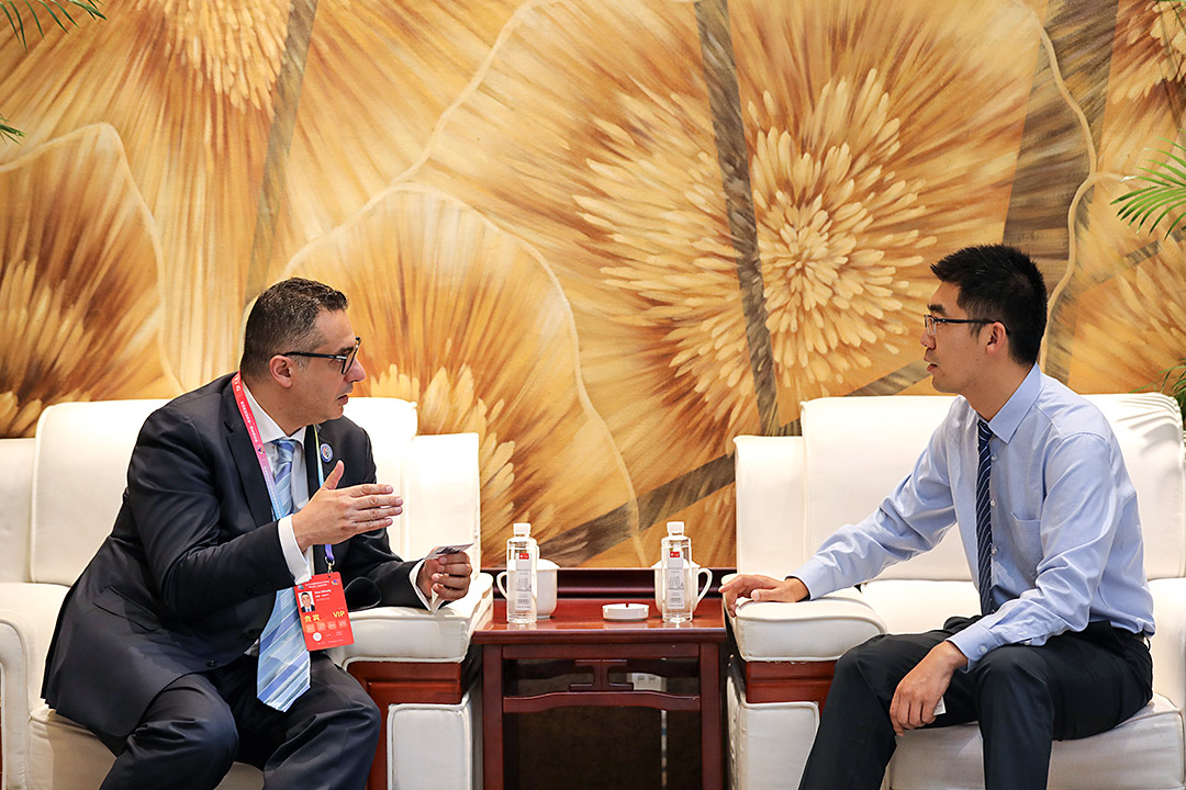 埃及投資與外貿(mào)部投資促進(jìn)事務(wù)全權(quán)公使AlaaEl-Bially(左一)同世邦集團(tuán)國際銷售總經(jīng)理劉茂勇開展親切會談